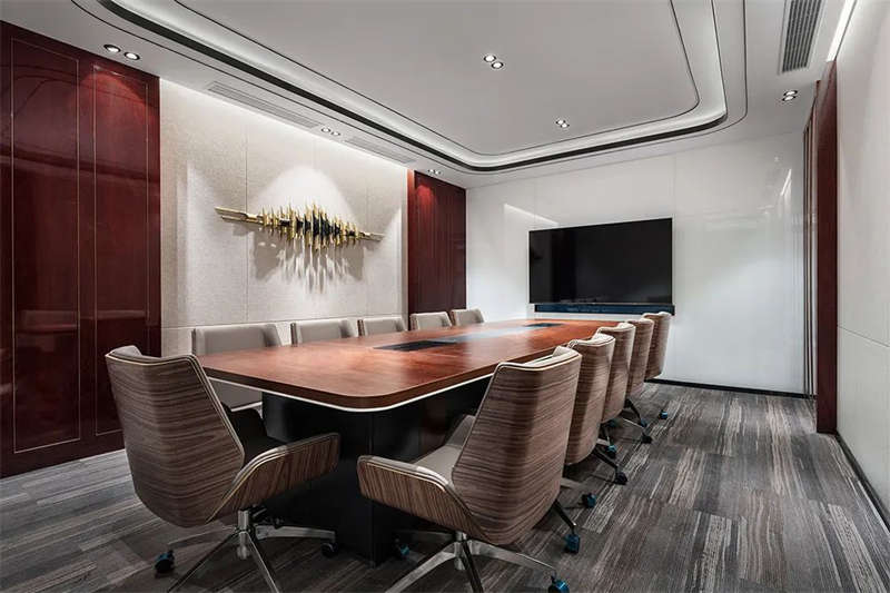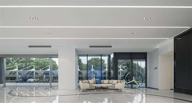 前廳頂部,鏡面質(zhì)感與光帶反射,使空間得到延伸、重疊呼應(yīng),營造出多維的視覺效果,同時打破科技辦公室設(shè)計的刻板印象,擁有寬敞開放的前臺設(shè)計、待客區(qū),層次、質(zhì)感、豐滿而厚重。