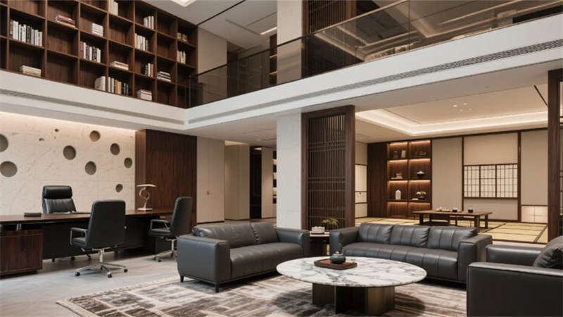 高管辦公區(qū)通過灰玻與豎向木紋鋁材構(gòu)筑半私密空間,L型胡桃木辦公桌與深棕真皮座椅彰顯商務質(zhì)感,獨立閱讀角的落地燈營造人文氛圍??偛棉k公室運用懸浮式書架墻與黑檀木辦公桌塑造權(quán)威感,環(huán)形皮革沙發(fā)組與天然大理石茶幾構(gòu)成高端會客場景,日式茶室通過木格柵與洞石墻面實現(xiàn)東西方美學交融。