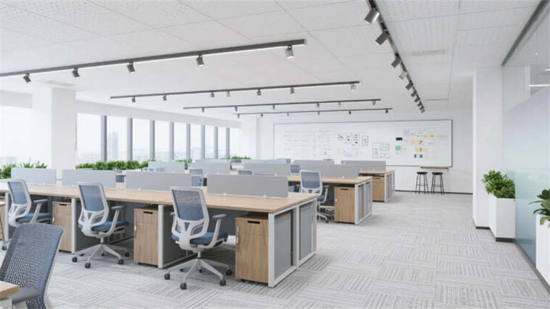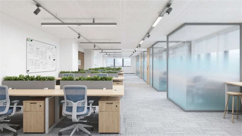 企業(yè)大堂延續(xù)外立面色系,雪花白大理石地面與深灰導視帶構(gòu)建空間骨架,曲面木紋石背景墻通過背光企業(yè)標識形成視覺焦點,漸變鋁方通吊頂?shù)木€性光帶引導人流走向。開放式辦公區(qū)以灰橡木辦公模塊為核心,沖孔鋁板吊頂整合軌道射燈系統(tǒng),漸變霧化玻璃隔斷內(nèi)置綠植槽,編織紋地毯有效降低行走噪音。