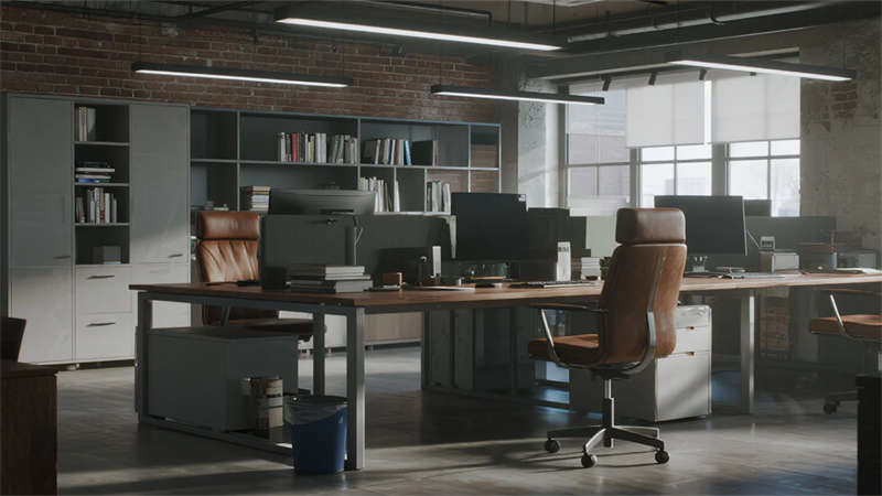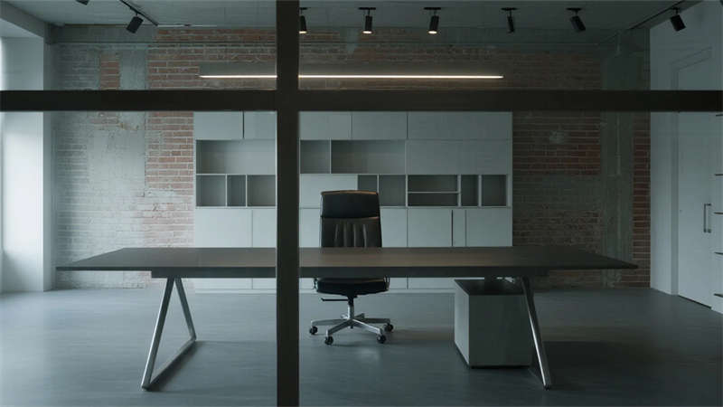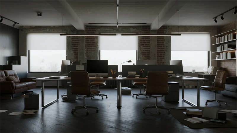 這組工業(yè)風(fēng)辦公室設(shè)計以裸露結(jié)構(gòu)和復(fù)古質(zhì)感為核心,通過混凝土、金屬和木質(zhì)材料的碰撞,打造出兼具實用性與藝術(shù)感的辦公空間??臻g保留了建筑的原始肌理,如天花板的管線和墻面的磚紋,搭配黑色鐵藝家具和深色調(diào)軟裝,營造出冷峻而富有張力的氛圍。局部通過皮質(zhì)沙發(fā)、綠植和暖光燈具軟化工業(yè)風(fēng)的硬朗感,增添人文氣息。