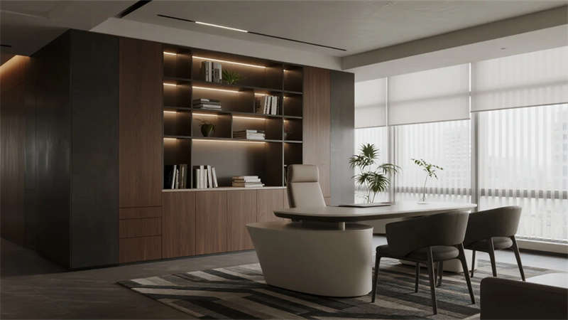 開放辦公區(qū)依托巨幅落地窗引入自然韻律,升降工位與模塊化家具賦予空間彈性;獨立辦公室通過垂直百葉調節(jié)光影私密性,暗藏式書柜燈光烘托沉穩(wěn)氣質。核心協(xié)作區(qū)打破傳統(tǒng)封閉模式,弧形沙發(fā)與可書寫玻璃墻激發(fā)即興創(chuàng)意,而茶水間綠植墻與城市景觀吧臺,則在高效節(jié)奏中注入呼吸感。