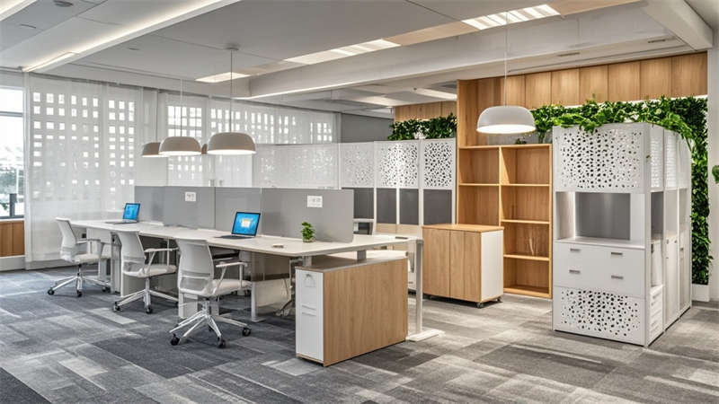 ④聲學吊頂確保35分貝以下靜音環(huán)境。色彩搭配采用70%淺灰奠定基調,20%原木色增添溫暖,10%企業(yè)藍作為點睛色。環(huán)保方面選用LEED認證材料,集成光伏玻璃幕墻年發(fā)電量達8萬度。