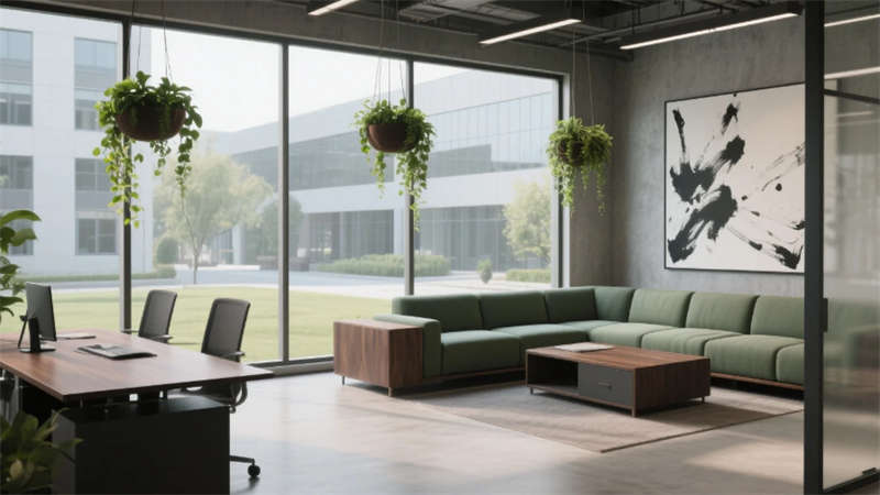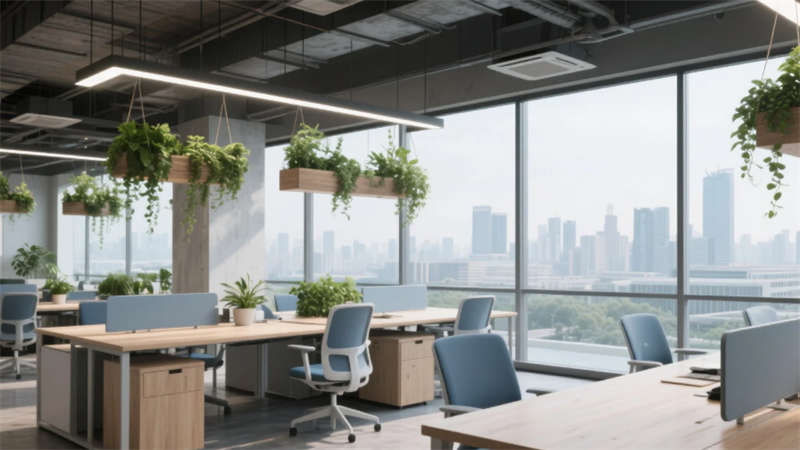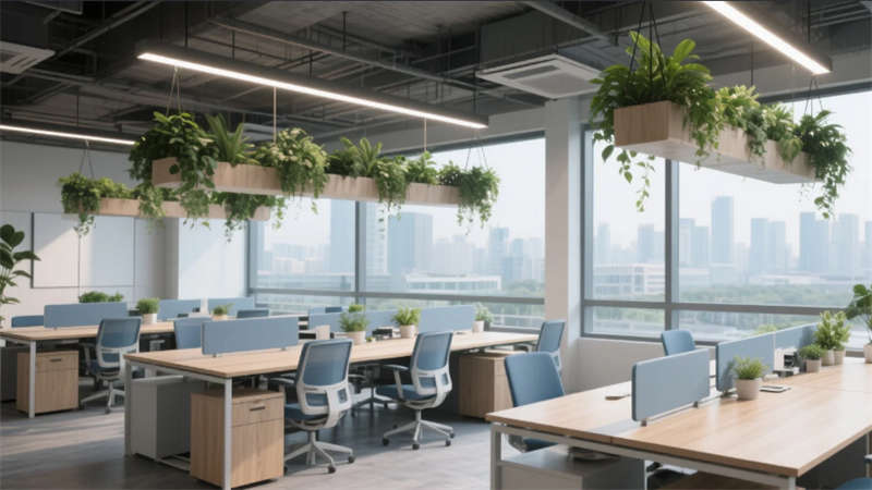 該辦公空間以"自然共生"為核心理念,將科技感與人文溫度融入兩千平米的開放場域。流動(dòng)的淺木色調(diào)貫穿始終,啞光金屬與微水泥形成質(zhì)感對(duì)話,模塊化家具構(gòu)建靈活場景。綠植生態(tài)系統(tǒng)從空中吊籃蔓延至苔蘚墻面,模糊室內(nèi)外界限。