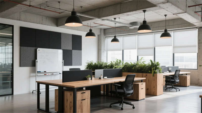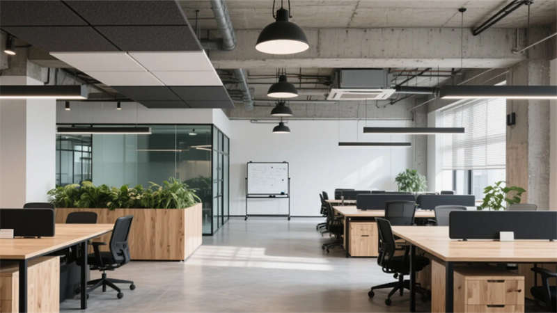 步入大堂,粗獷的混凝土墻面與水磨石地面形成質(zhì)感對(duì)話,懸浮金屬網(wǎng)天花下,原木前臺(tái)與背光綠植墻暈染出溫潤(rùn)生命力。開放式辦公區(qū)延續(xù)工業(yè)基調(diào),模塊化橡木桌搭配黑色鋼架,綠植隔斷巧妙劃分空間,自然光穿過智能遮陽(yáng)簾,在混凝土天花上投下流動(dòng)的光影詩(shī)行。