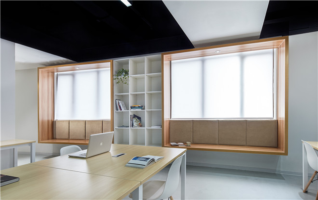 在78平空間內(nèi)布置20個工位、茶水間、會議室和一個獨(dú)立辦公室并不容易,設(shè)計師在平面功能最大化,營造豐富的灰空間,消除辦公空間以往嚴(yán)肅緊張的固有印象。黑白極簡的設(shè)計語言在節(jié)省造價的同時完美契合了IT公司的現(xiàn)代感與科技感,而木質(zhì)的飄窗是整個黑白空間的一抹暖色,在有限的面積中為員工營造了輕松的閱讀與交流空間。豐富的玻璃隔斷形成通透的空間,相互貫穿,模糊了空間屬性,從而削弱小空間帶來的局促感。