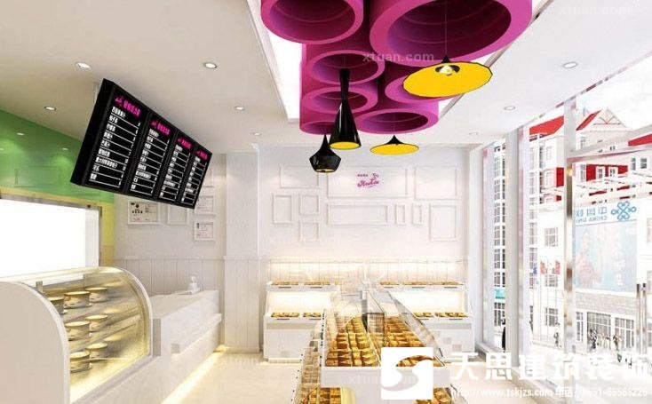 第二就是以淡雅為主色彩是蛋糕店裝修的首選。粉色裝潢就是很好的范例,給人溫馨的感覺,不要采用黑色等較深沉的色彩。