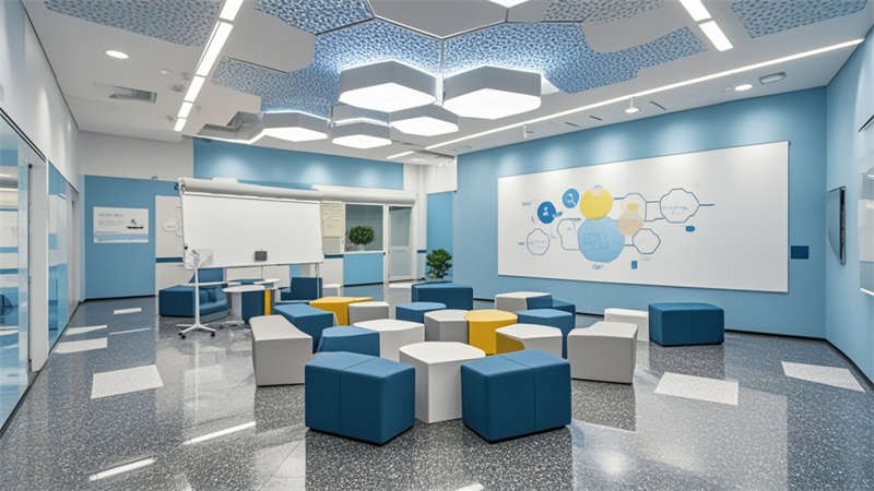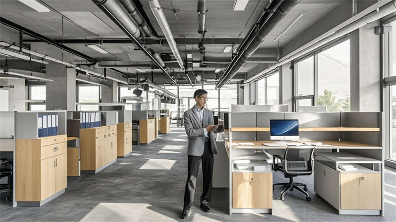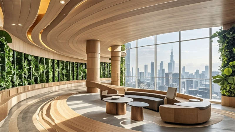 本1500㎡現(xiàn)代簡約辦公室設(shè)計以'高效協(xié)作·人文關(guān)懷'為核心,采用模塊化空間布局提升使用彈性。主色調(diào)選用淺灰、白、木三色系,局部點綴企業(yè)深藍(lán)色強化品牌認(rèn)知。開放式辦公區(qū)采用1.2m×1.8m標(biāo)準(zhǔn)工位模塊,通過玻璃隔斷實現(xiàn)90%自然光滲透率。智能照明系統(tǒng)根據(jù)日照強度自動調(diào)節(jié)色溫,全年節(jié)電率達(dá)35%。核心筒改造區(qū)運用曲面木飾面弱化建筑結(jié)構(gòu),形成自然交流節(jié)點。聲學(xué)設(shè)計方面,蜂窩吸音板(NRC 0.85)與隔音艙(STC 52)組合控制噪音污染。茶水區(qū)采用磁吸軌道插座系統(tǒng),支持設(shè)備靈活接入。所有家具均符合WELL建筑標(biāo)準(zhǔn),辦公椅配備6向調(diào)節(jié)功能。通過BIM技術(shù)實現(xiàn)管線綜合,保留3.2米凈高營造開闊感。