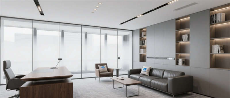 高管辦公室通過(guò)灰玻霧化膜實(shí)現(xiàn)私密與通透的辯證,胡桃木辦公桌與深灰沙發(fā)組演繹商務(wù)美學(xué),隱藏式智能控制系統(tǒng)將科技感融于無(wú)形??萍紩?huì)議室創(chuàng)新采用環(huán)形桌體與360°攝像系統(tǒng),陣列麥克風(fēng)與補(bǔ)光燈帶打造沉浸式遠(yuǎn)程協(xié)作場(chǎng)景。從光伏玻璃幕墻到模塊化綠植系統(tǒng),從智能升降辦公桌到節(jié)能設(shè)備集群,每個(gè)細(xì)節(jié)都銘刻著可持續(xù)發(fā)展的空間基因。