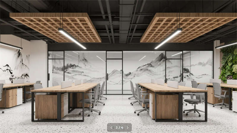 空間脈絡(luò)延續(xù)山水哲學——開放式辦公區(qū)的水墨玻璃隔斷營造朦朧畫境,創(chuàng)想實驗室可書寫墻面激發(fā)思維奔流。協(xié)作沙龍區(qū)的階梯布局與動態(tài)山水投影,催化靈感迸發(fā)的化學反應。靜思艙藏身綠植墻中,為深度思考保留秘境。