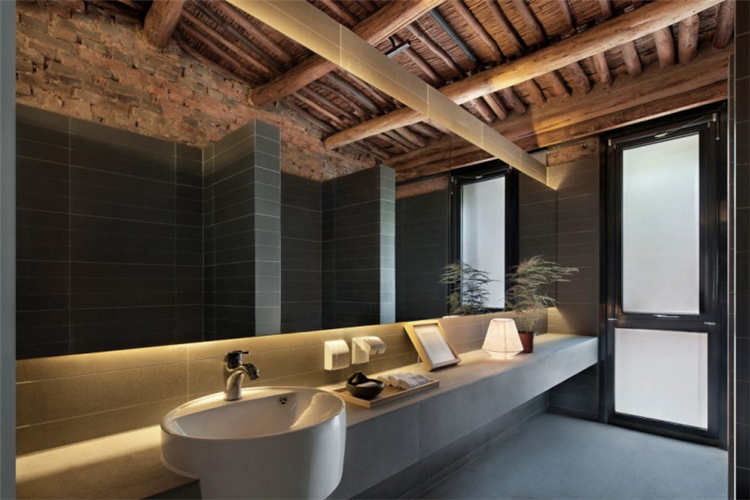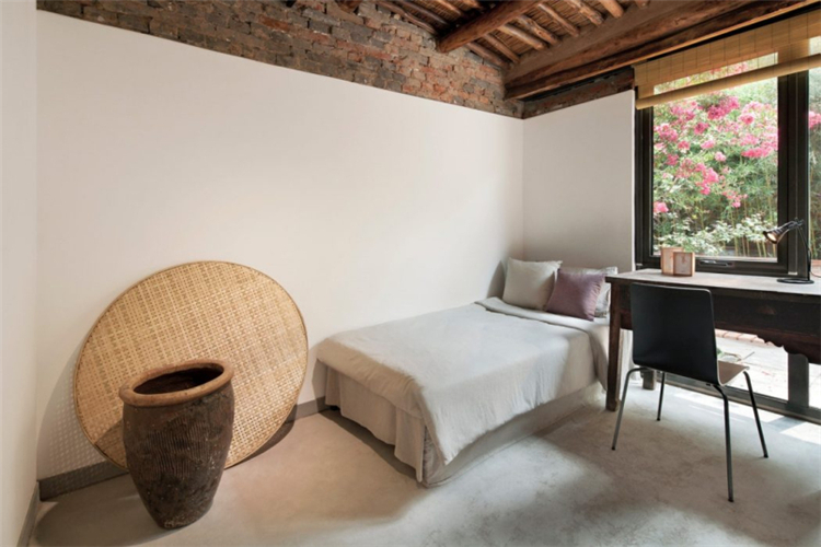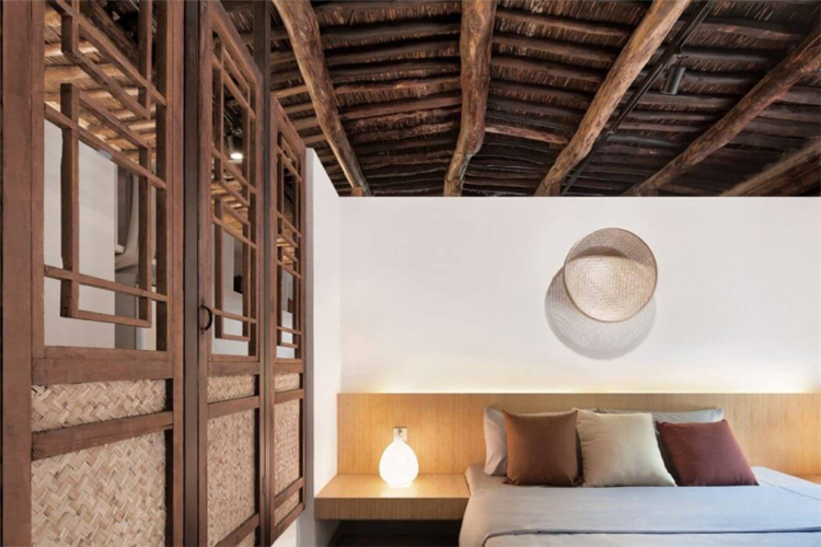 而我們在這次的民宿的功能布局方面,我們根據與居民的詳細溝通,了解他們的日常生活和習慣,進行調整,重新組織平面圖。在我們拆除吊頂后,更多的空間被釋放,原始的木結構和稻草覆蓋的天花板紋理終于顯露出來,講述了一個時間的故事。在現場勘察過程中,我們在建筑物西側和鄰近墻壁之間發(fā)現了一條約80厘米寬的狹窄通道。因此,我們在走廊盡頭向西側設計了一個觀景窗。在窗外,擺動的竹影有助于將室內空間與自然環(huán)境相連。