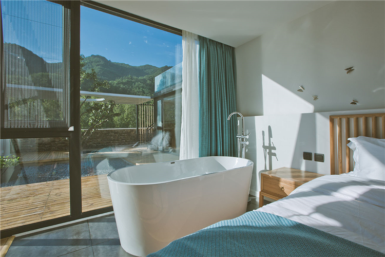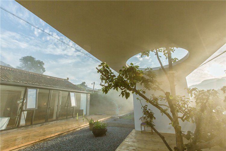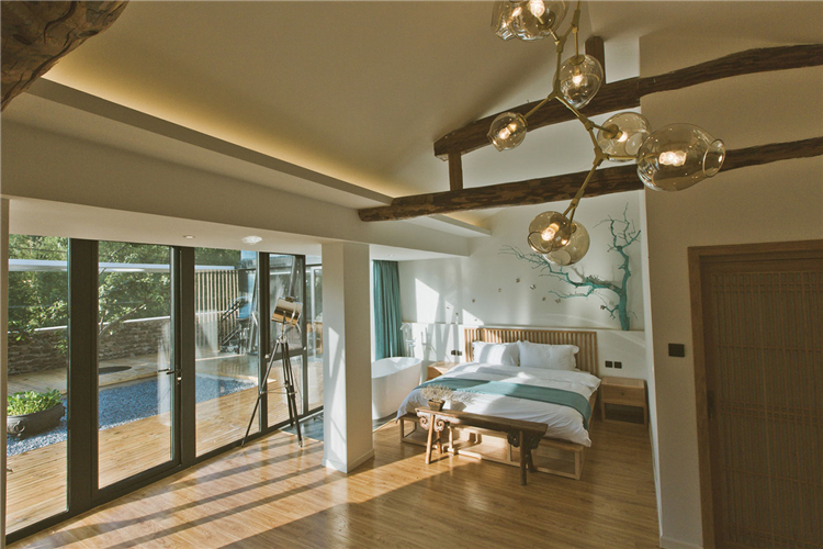 “隨著越來越快的生活節(jié)奏我們每天奔忙,每天遺忘城市越來越近,鄉(xiāng)村卻越來越遠”。這所名為“畫框里”的民宿位于水泉子村,而名字寓意為將百里畫廊的山水美景留在畫中院中??煽吹矫逼鋵嶌`動的山水畫這四季的變幻,凝集了我們對生活所有的向往。落地窗邊放置了浴缸做一個泡泡浴一眼望去是院落的美景和遠山的意境。主臥空間很寬敞,新中式的原木配灰色的簡易家具些許的現(xiàn)代元素金屬攝影燈使房間內多一份輕松感。