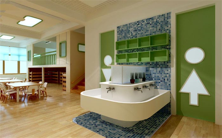 洗手區(qū)域的設(shè)計:此處通往的是就餐區(qū),在洗手池的設(shè)計上,設(shè)計師對地面、洗手池都做了處理,目的就是為了避免因為水造成的地面濕滑,兩個門一個進一個出,設(shè)計是希望可以從小培養(yǎng)孩子排隊的意識,一進一出之間也見證了教育的重要性。