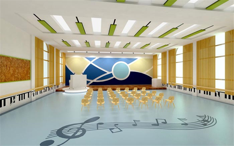 表演區(qū)域的設(shè)計:這是最后一個音樂教室,但是這個教室在屬性上與前兩個稍有不同,在滿足音樂教室的同時,也滿足表演的需求,設(shè)計師希望每一個孩子都是一個表演家,在臺上可以盡情的表演,培養(yǎng)每一個孩子表演、演講的能力。