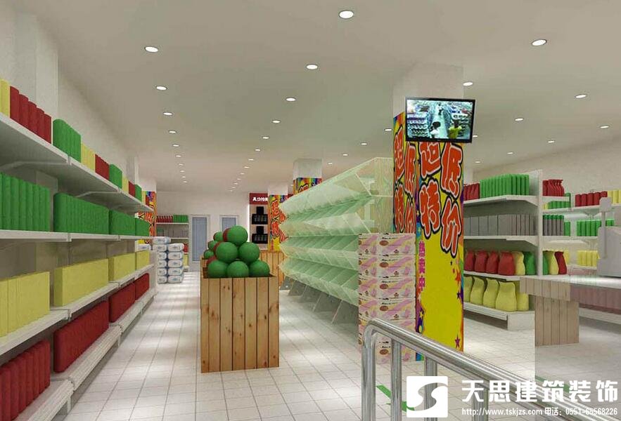 便利店對(duì)店鋪層高的要求一般在3米以上,但由于所選擇的店面多數(shù)處于底層,天花板下多數(shù)有下水管、電線管、消防管等管道,這時(shí)不要安裝吊頂天棚將這些管道隔離,只要這些管道粉刷成純白色,并將光源置于管道之下即可,這樣既可以保證商店的空間,又可以節(jié)省費(fèi)用。