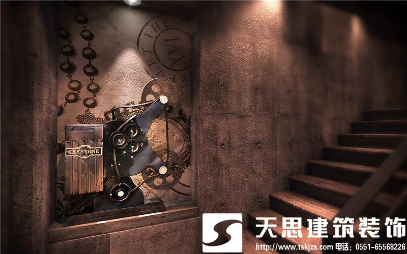 水晶燈飾自然垂掛在房間的邊角,各式桌椅隨意擺放,鋼木磚石與燈光渾然天成。信手繪制在墻面的齒輪充滿動(dòng)感,拾階而上又將是另一番別有洞天。