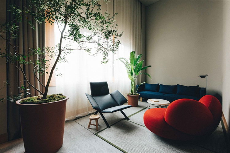 酒店的客房同樣色彩斑斕??头康拈_放空間中央立有大型紗柱,懸掛著自然染色的靛藍(lán)色漸變織物??头靠崭唛_闊,四周擺設(shè)有CKR設(shè)計(jì)的沙發(fā),皮革躺椅及一系列盆栽裝飾。同時(shí),房間內(nèi)配有唱片機(jī)及精選的黑膠唱片,為房間帶來(lái)了親切感。房間內(nèi)的照明采用特別設(shè)計(jì)的燈具,其中以定制的紙質(zhì)燈最具特色。此外酒店客房,套房及復(fù)式套房中,都采用了紡織品裝飾的定制雙人沙發(fā)。