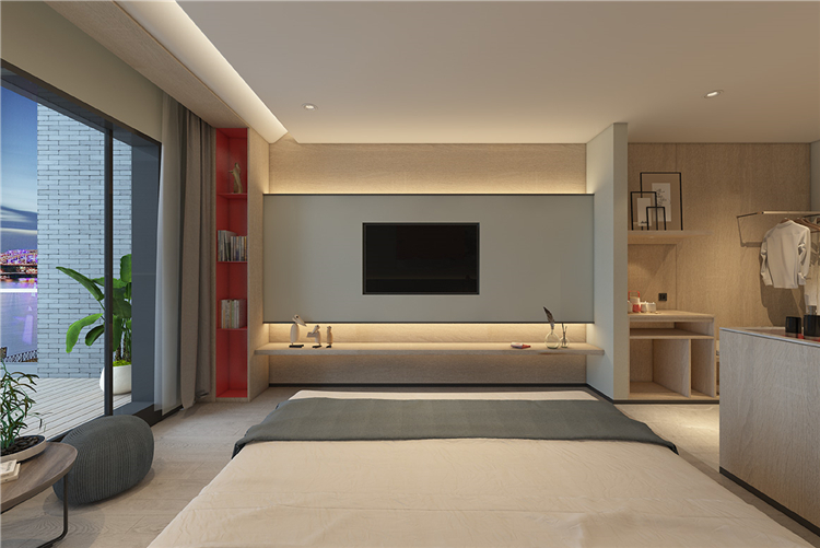 這些匠心的設(shè)計,令空間在保留原有通透性的情況下規(guī)整而不凌亂,給人以直觀的親近感受臥房的燈光在功能上具有有針對性,點光源很少,多采用柔和的氛圍光,而貼心明亮的臺燈設(shè)計,亦可滿足人們的閱讀需求。