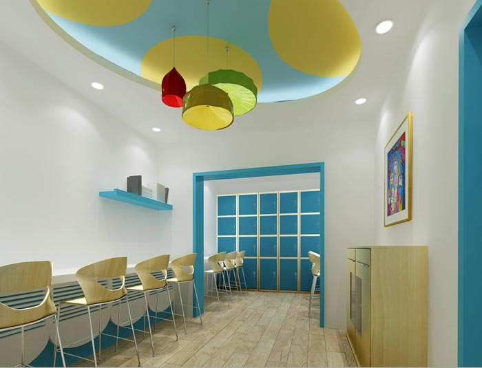 休息區(qū)域的設(shè)計:此處不僅可供教師休息,同時也可供孩子們在這里玩耍、娛樂,設(shè)計師的目的就是想讓大家在這里可以感受到陽光的溫暖,在此處陽光滲透到每一處空間,設(shè)計師希望陽光、自然可以掃清教師心中的煩躁,同時也給孩子更多的溫暖。
