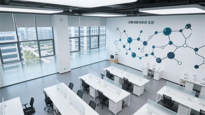 物流中庭的挑空設(shè)計打破廠房尺度壓迫感,懸掛式數(shù)據(jù)看板如抽象藝術(shù)品,與玻璃穹頂投下的天光共構(gòu)科技禪意。研發(fā)區(qū)可移動實驗裝置墻體現(xiàn)柔性生產(chǎn)理念,分子結(jié)構(gòu)藝術(shù)墻繪暗喻制造背后的科學探索。