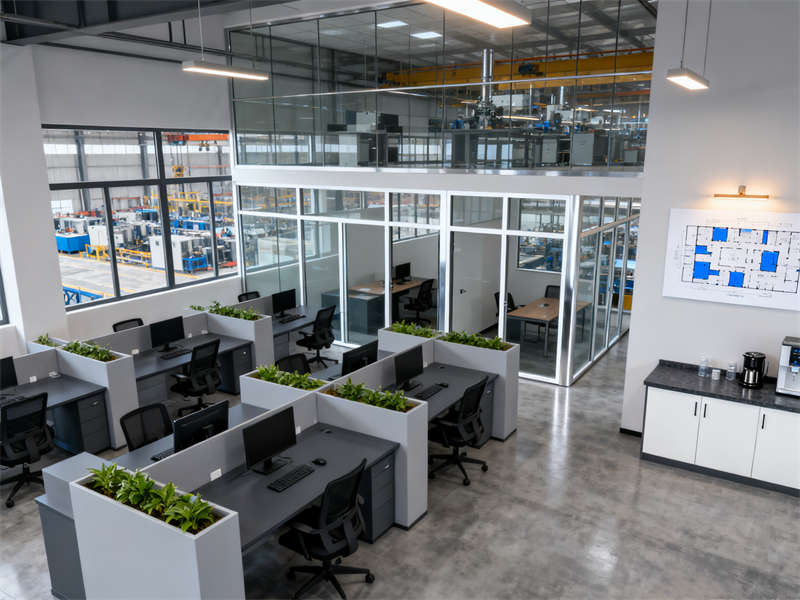 成品檢驗(yàn)區(qū)配備精密檢測(cè)儀器,合理的分區(qū)設(shè)計(jì)與適宜的照明,為精準(zhǔn)檢測(cè)提供保障。員工辦公區(qū)與休息區(qū)則兼顧實(shí)用性與舒適度,開(kāi)放式辦公布局搭配獨(dú)立辦公室,休息區(qū)的沙發(fā)、餐柜等設(shè)施,為員工營(yíng)造出良好的工作與放松環(huán)境。整體設(shè)計(jì)在色彩與材質(zhì)運(yùn)用上保持高度統(tǒng)一,既體現(xiàn)工業(yè)廠房的專(zhuān)業(yè)特質(zhì),又增添了人性化氛圍。?
