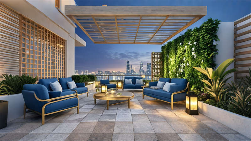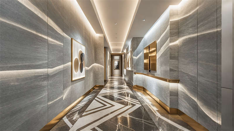 色彩體系以香檳金與深海藍為主調(diào),大堂采用香檳金金屬線條勾勒建筑肌理,搭配深海藍大理石營造視覺重心。客房區(qū)運用暖灰硬包墻面平衡色彩強度,通過2700K暖光與4000K中性光分區(qū)照明塑造晝夜場景。材質(zhì)組合注重層次:大理石地面、金屬構(gòu)件、絨布軟包形成質(zhì)感三部曲。