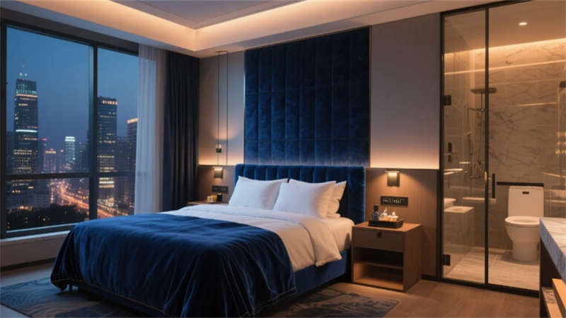 客房設(shè)計(jì)聚焦人性化體驗(yàn):大床房以深藍(lán)色絲絨床頭與城市夜景形成戲劇性對比,透明玻璃隔斷的圓形浴缸賦予空間通透感;雙床房通過原木色書桌、飄窗茶臺與抽象掛畫,平衡商務(wù)與居家需求。走廊則運(yùn)用深藍(lán)色幾何地毯與隱藏式燈帶,引導(dǎo)視線至盡頭的藝術(shù)畫作,靜謐中暗藏張力。