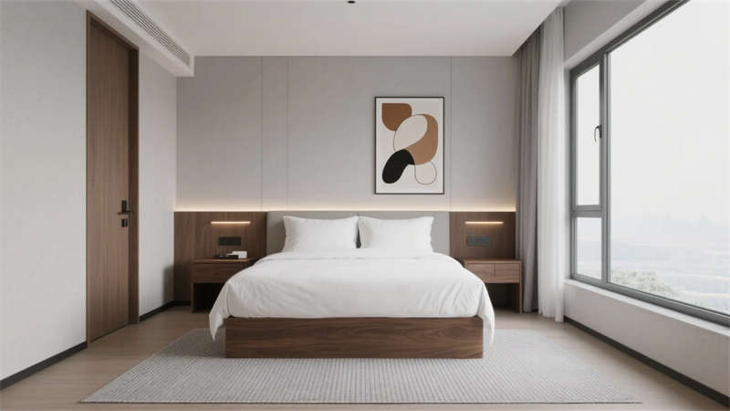 步入挑高大廳,弧形前臺(tái)與懸浮燈飾構(gòu)成視覺(jué)焦點(diǎn)。天然石材地面倒映著落地窗引入的天光,米白色沙發(fā)組錯(cuò)落分布于綠植景觀間,模糊室內(nèi)外邊界的同時(shí),為商務(wù)會(huì)晤創(chuàng)造輕松場(chǎng)域??头垦永m(xù)克制設(shè)計(jì)語(yǔ)言,懸浮式家具減輕空間負(fù)重,隱藏?zé)魩г诨宜{(lán)色床品上投下柔光,全景窗將城市天際線(xiàn)轉(zhuǎn)化為動(dòng)態(tài)壁畫(huà)。