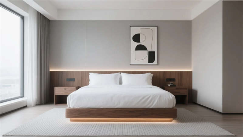 這個(gè)商務(wù)酒店的設(shè)計(jì)以現(xiàn)代簡(jiǎn)約美學(xué)重構(gòu)城市商旅空間。設(shè)計(jì)摒棄繁復(fù)裝飾,運(yùn)用暖灰與胡桃木的主色調(diào)營(yíng)造溫潤(rùn)氛圍,香檳金金屬細(xì)節(jié)勾勒精致輪廓,在理性秩序中注入藝術(shù)溫度。