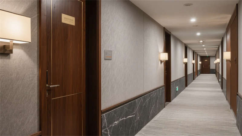 健康關(guān)懷滲透于細(xì)節(jié)設(shè)計(jì)中。健身房落地窗最大化引入自然景觀,橡膠地面與鏡面墻體形成虛實(shí)對(duì)話(huà);電梯廳香檳金轎廂與石材墻面碰撞出質(zhì)感層次,每處轉(zhuǎn)角皆設(shè)置藝術(shù)端景,讓行進(jìn)過(guò)程成為美學(xué)巡禮。走廊絨面墻體的細(xì)膩觸感消解了通道的單調(diào)性,精心計(jì)算的燈光角度引導(dǎo)賓客自然抵達(dá)目的地。