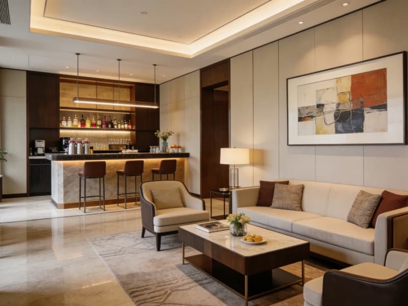 五層為特色配套層,設(shè)有行政酒廊、健身房與SPA區(qū)。行政酒廊提供專屬服務(wù),健身房配備先進(jìn)器材,SPA區(qū)以自然色調(diào)為主,搭配舒緩音樂(lè),讓客人放松身心。