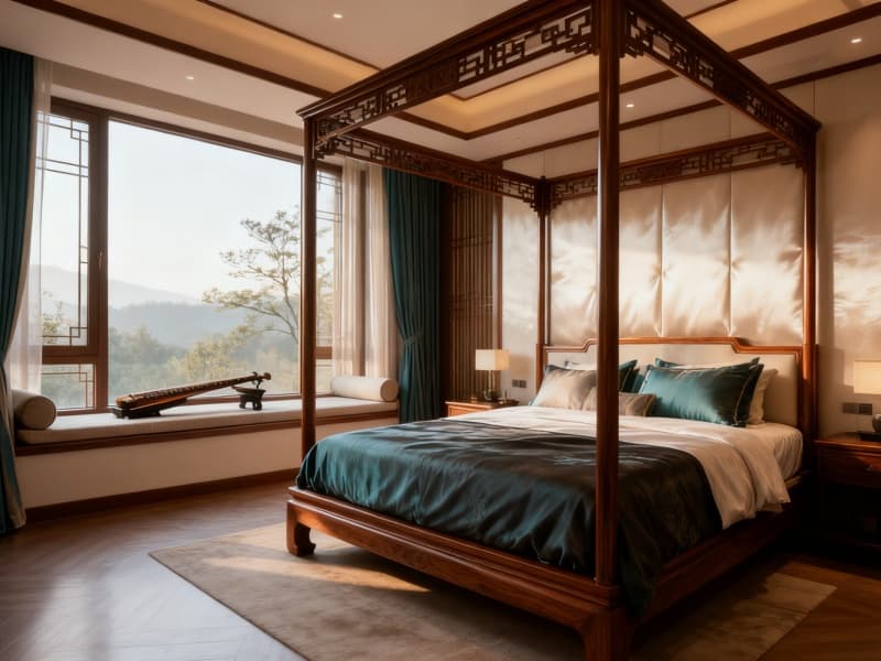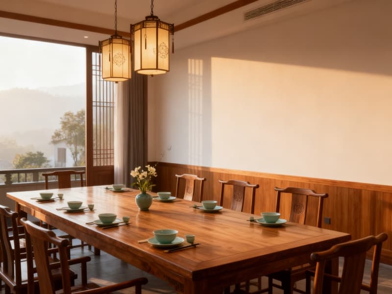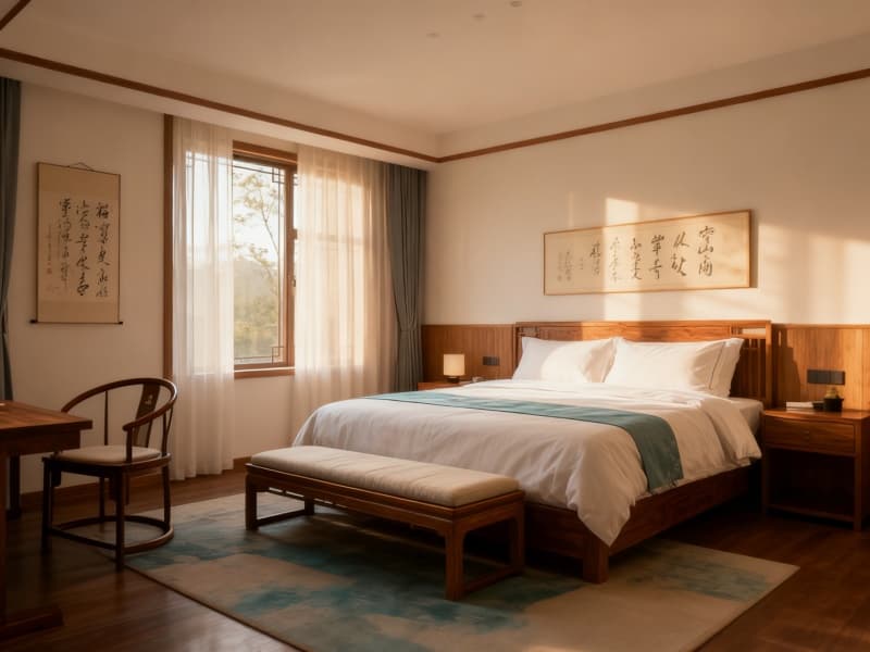室內(nèi)空間借由廣角鏡頭可感知的通透布局,讓原木紋理成為空間的重要語言。公共區(qū)域的桌椅、隔斷均選用帶有自然木紋的實(shí)木材質(zhì),搭配淺色系軟裝,清晨的光線透過窗欞灑入,在木紋上形成柔和的光影,增添空間的層次感??头吭O(shè)計(jì)注重細(xì)節(jié),床頭背景墻以簡約的中式紋樣點(diǎn)綴,床品選用素雅色調(diào),與原木家具呼應(yīng),營造出安穩(wěn)休憩的氛圍。?