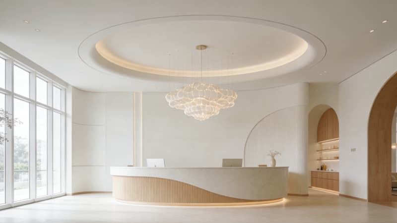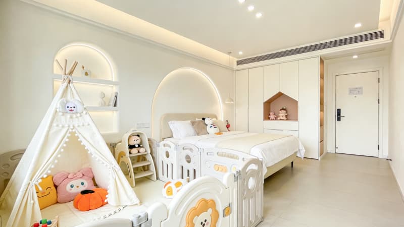 室內公區(qū)包含弧形前臺大廳、咖啡書吧、簡約餐廳等功能空間,動線流暢、采光充足,兼具實用性與打卡屬性??头亢w大床房、雙床房、溫馨親子房,統(tǒng)一奶油色系與懸浮床、飄窗等細節(jié),舒適耐看。衛(wèi)生間干濕分離、走廊極簡感應燈光,兼顧品質與體驗。