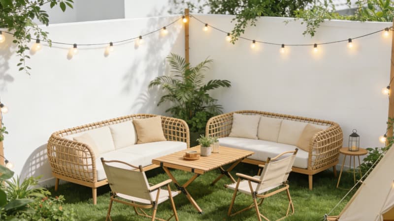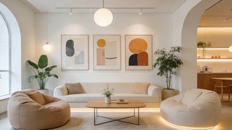 本項目主打INS風奶油白極簡民宿設計,整體以奶油白、淺木色、淺灰為主色調,營造高級治愈、溫柔干凈的空間氛圍。外立面采用大面積玻璃幕墻搭配弧形門頭與簡約線條,通透大氣;庭院融合露營風休閑區(qū)、草坪、燈串與綠植,打造沉浸式戶外休閑場景。