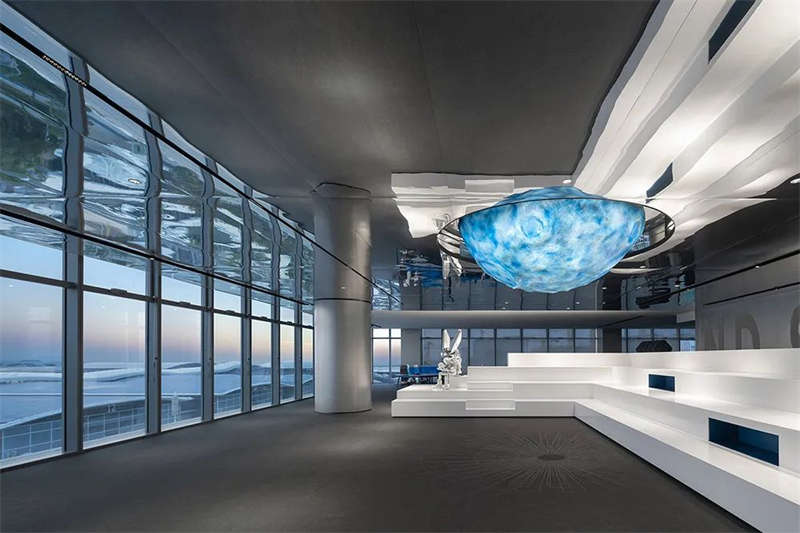 白色臺階半圍合而成的區(qū)域,擁有絕佳的風(fēng)景,設(shè)計充分挖掘功能的實用性,帶有視覺沖擊力的隕石吊燈和Robbie兔,讓這里具備了舞臺的屬性,成為具有強交互感的沙龍區(qū)。