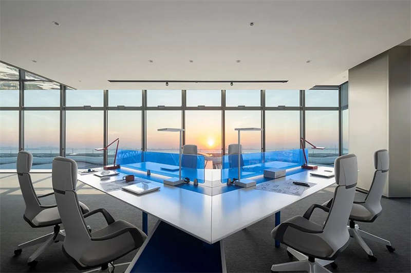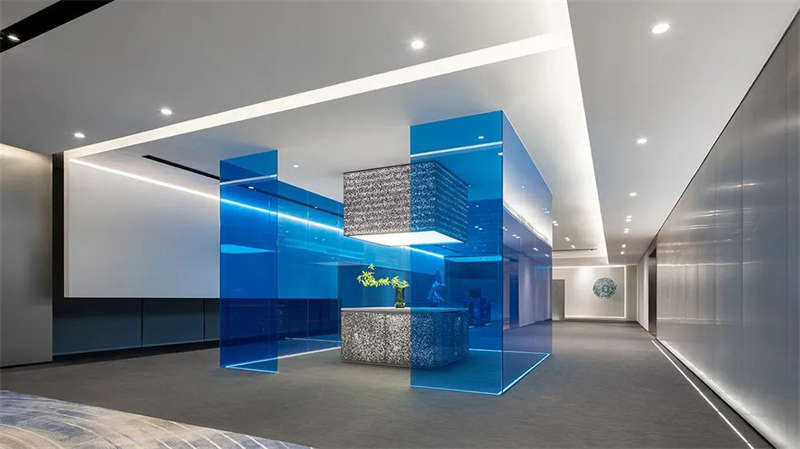 設(shè)計師在灰調(diào)的空間中,注入純凈的克萊因藍(lán),高飽和度的單純色彩具有神奇的魔力,讓人們在強烈的視覺沖擊下迷失感官,與室外的海天融通一體,達(dá)致沒有感官桎梏的心靈自由;灰色則讓空間保有充裕的從容,以及留白的呼吸感。以此實踐在物質(zhì)之上,具有純粹精神的空間情景。