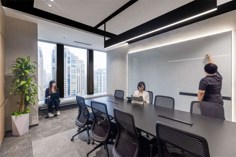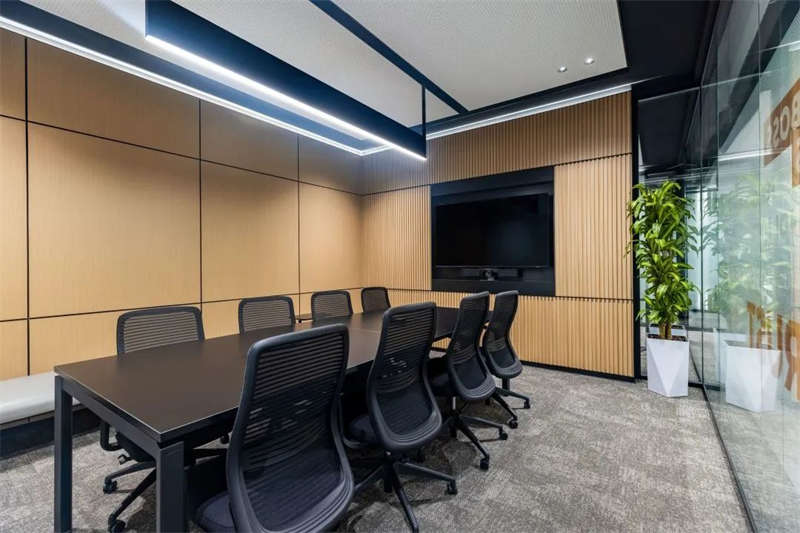 所有的會議室中,電視屏背景墻均以縱橫相交的豎條黑色U形槽做了分塊處理,在電視屏幕安裝位置上保持了統(tǒng)一原則,電視屏垂直居中,上下線條與背景墻上部、底部的距離相等。諸如此類的設(shè)計,使得辦公空間視覺條理性得到了加強(qiáng)。