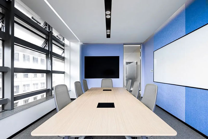 封閉會議室采用玻璃隔斷既保留了采光也確保了隔音需求,配合磨砂膜的使用保護(hù)了使用人員的私密性。
