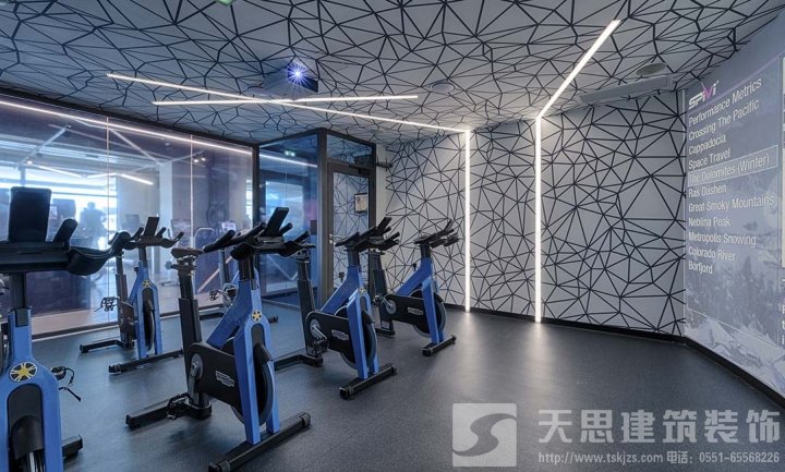 3、動(dòng)感單車房設(shè)計(jì) 動(dòng)感單車房的裝修和操房差不多,在風(fēng)格設(shè)計(jì)中也要求注意與整個(gè)健身房的風(fēng)格融合統(tǒng)一,不要只追求酷炫感。動(dòng)感單車是一個(gè)特殊項(xiàng)目,具有極強(qiáng)的煽動(dòng)性,可以即刻提升會(huì)員或參觀者的健身欲望,因此一般安排在整個(gè)健身房都能注意到的空間里。