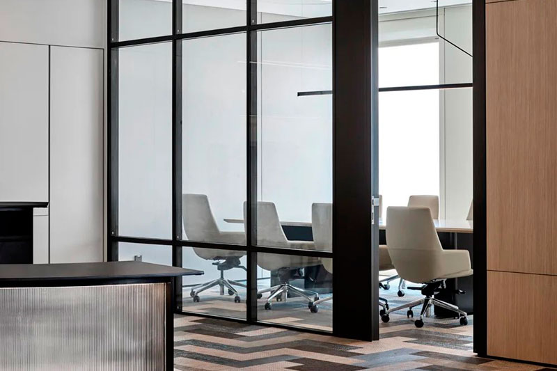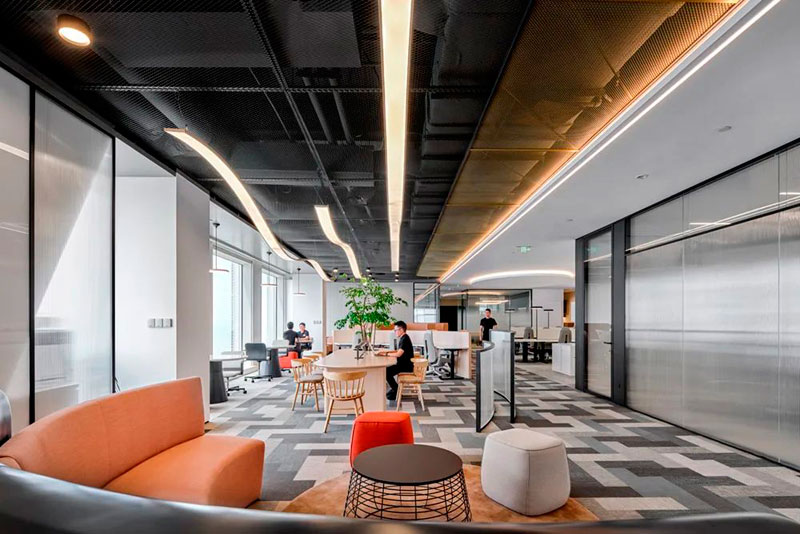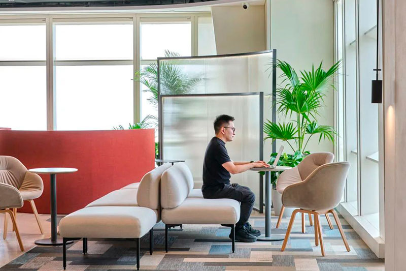 后場(chǎng)辦公區(qū)延續(xù)了前廳的辦公理念,結(jié)合不同功能形式的會(huì)議室、電話間,提供了多選擇的工作模式,簡(jiǎn)潔而高效。大量可再生面料的墻飾、可回收吸音板和仿生苔蘚的應(yīng)用,豐滿了視覺層次并極大提升了空間的聲學(xué)效果。