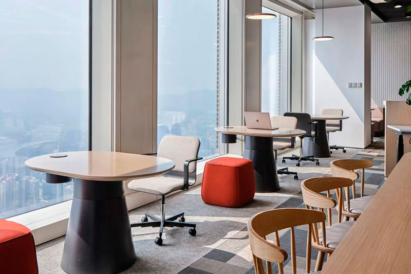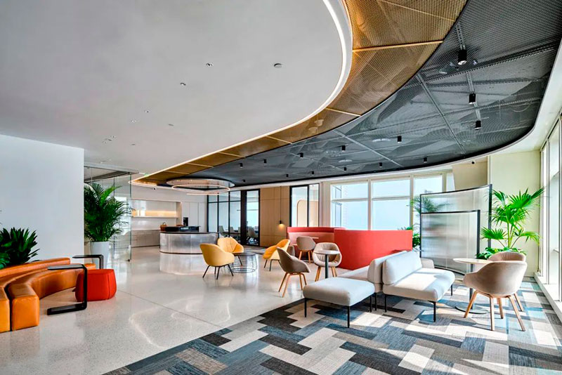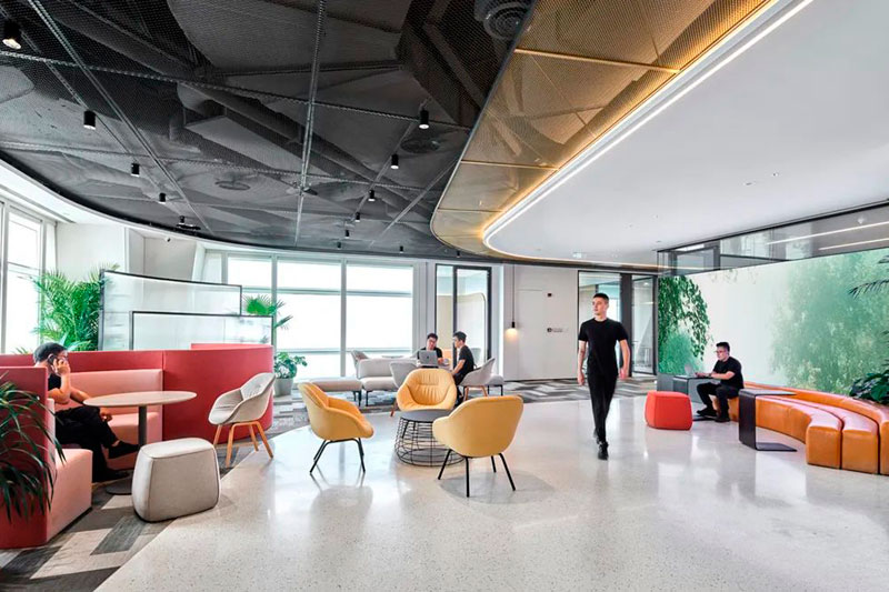 不同于投資公司的傳統(tǒng)形象,設(shè)計(jì)師以一個(gè)圓島吧臺(tái)和開敞的自由交流區(qū)作為前廳接待場(chǎng)所。大量的自然光涌入室內(nèi),明凈開闊。天花地面是圓轉(zhuǎn)流動(dòng)的曲線造型,采用水磨石地面、金屬網(wǎng)天花、Bolon塑膠地毯等各種新環(huán)保材料,輔以色彩鮮麗的多功能家具組合、大型LED屏和隨處點(diǎn)綴的綠植,呈現(xiàn)出年輕、現(xiàn)代、科技而又充滿能量的生命氣息。