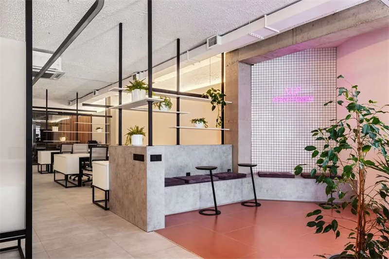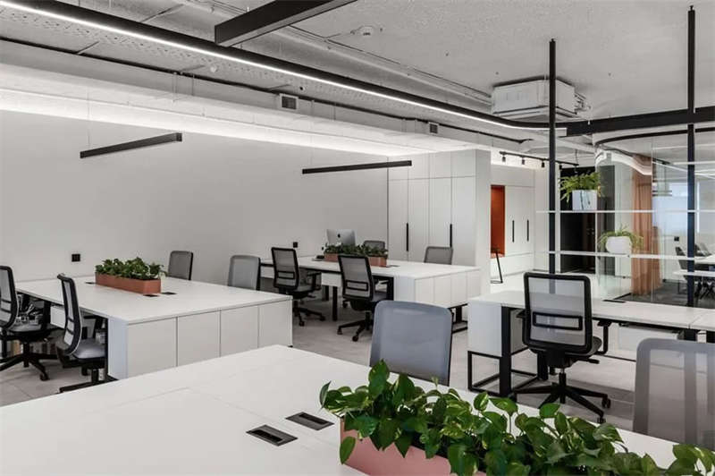 淺灰色的頂面與地面,配以白色墻體和主體辦公家具,再輔以縝密的燈光照明,讓室內(nèi)呈現(xiàn)明亮純凈的光彩質(zhì)感;黑色線性元素的加入豐富了空間構(gòu)成和視覺趣味性;唯一的暖棕色彩的點(diǎn)綴讓空間更靈動(dòng)更富有層次感,也為純凈極簡(jiǎn)的空間帶去一抹溫暖氣息。