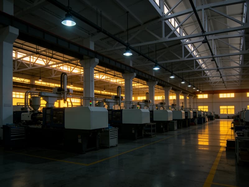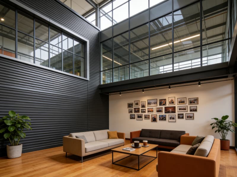 進入廠房內(nèi)部,生產(chǎn)區(qū)域挑高設(shè)計,空間開闊,頂部的桁架結(jié)構(gòu)裸露在外,搭配軌道式吊燈,營造出強烈的工業(yè)氛圍。地面選用耐磨的金剛砂地坪,承載能力強且便于清潔,滿足高強度生產(chǎn)需求。