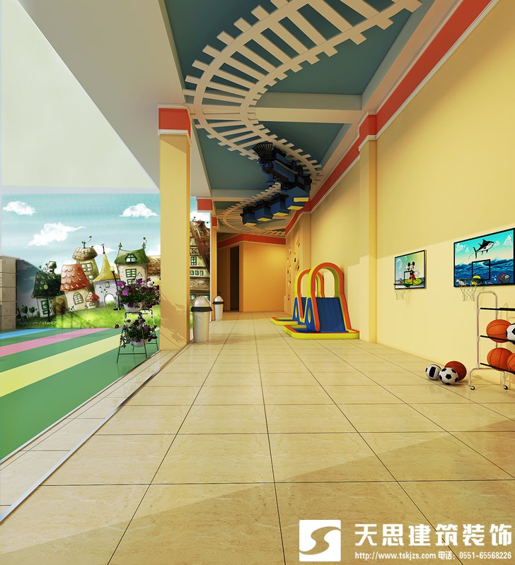藝術(shù)幼兒園環(huán)境,首先在色彩上,應(yīng)該給幼兒以美的視覺(jué)享受。圖畫(huà)色澤宜單純,接近自然,這樣的色彩令純潔的孩子們產(chǎn)生豐富的想象:廣袤無(wú)邊的綠色草原、密密的森林、遼闊的藍(lán)天、飄浮的白云、蔚藍(lán)的海洋和可愛(ài)的小動(dòng)物們。這些單純、源于自然的色彩,易使閱歷淺短的幼兒產(chǎn)生共鳴、易于理解。便于他們欣賞、借鑒、表現(xiàn)。合肥的幼兒園都比較注重色彩的使用,但總體上水平不高,天思裝飾在設(shè)計(jì)裝修中感受頗深,有的幼兒園只是簡(jiǎn)單的通過(guò)五顏六色的色彩來(lái)展示環(huán)境的炫目。幼兒們喜愛(ài)明快的色彩對(duì)比,活潑好動(dòng)的幼兒從中可以感受到色彩變化的節(jié)奏和共振。在為幼兒們創(chuàng)造色彩對(duì)比、跳躍的同時(shí),應(yīng)考慮畫(huà)面的整體美,采用較大淺色塊支撐,可使畫(huà)面既有局部美的變化又有整體協(xié)調(diào)感,能解決幼兒園一堵墻面內(nèi)容多色調(diào)不易統(tǒng)一的問(wèn)題。使環(huán)境更藝術(shù)化。