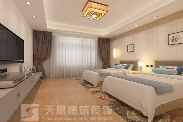 小型酒店客房,多以標(biāo)準(zhǔn)間、單人間為主,面積一般不會太大,不過可以利用延伸視覺效果的方法,來提升客房空間感。比如運(yùn)用由淺到深、富有層次感的彩色壁紙,搭配淡雅干凈的鋪蓋,安裝采光自然、光照充足的落地窗,延伸空間的同時也提高了舒適度。