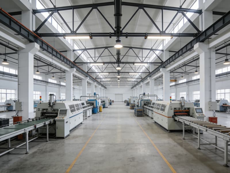 走進(jìn)廠房內(nèi)部,生產(chǎn)區(qū)域空間開闊,挑高的設(shè)計為大型生產(chǎn)設(shè)備提供了充足的安置空間。頂部采用裸露的鋼結(jié)構(gòu)桁架,搭配軌道式照明燈具,既滿足了生產(chǎn)作業(yè)對照明的需求,又強化了工業(yè)氛圍。地面鋪設(shè)耐磨的水泥自流平,堅固耐用且便于清潔,符合工業(yè)生產(chǎn)的實際要求。生產(chǎn)設(shè)備按照工藝流程有序排列,各區(qū)域之間設(shè)置了寬敞的運輸通道,確保物流運輸?shù)捻槙掣咝А?br />