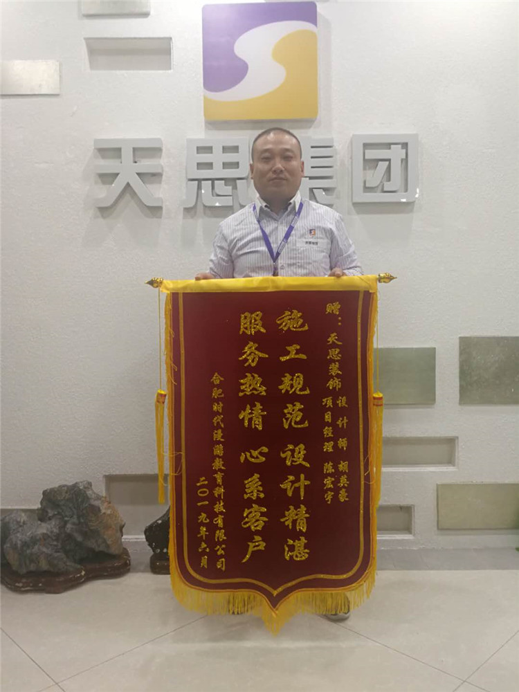 業(yè)主在百忙之中特意來天思裝飾贈送錦旗,對施工項(xiàng)目經(jīng)理陳工的施工質(zhì)量和服務(wù)贊不絕口.業(yè)主道:他懷著萬分感激之情,向陳工、胡工及天思裝飾全體員工表示真誠的感謝和良好的祝愿. 錦旗上寫著"施工規(guī)范 設(shè)計(jì)精湛 服務(wù)熱情 心系客戶"16個(gè)燙金大字,錦旗雖小,分量厚重.