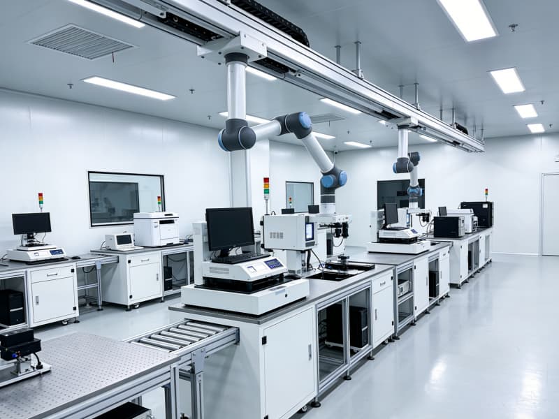 產(chǎn)品測(cè)試區(qū)以白色為主色調(diào),營(yíng)造簡(jiǎn)潔純凈的環(huán)境。各類先進(jìn)的測(cè)試儀器有序擺放,頂部的軌道式機(jī)械臂可輔助完成復(fù)雜測(cè)試流程。