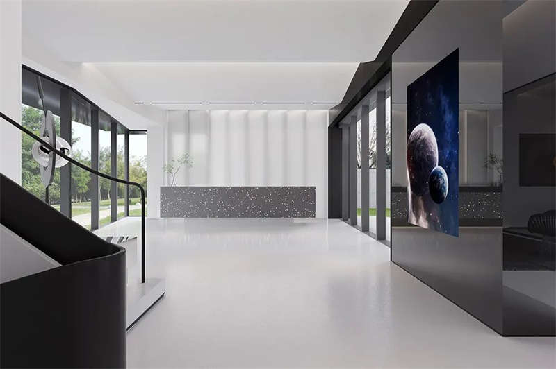 一層前臺,以黑白創(chuàng)作出一個(gè)極致簡潔的空間,兩側(cè)落地開窗實(shí)現(xiàn)無限延伸,空間的邊界更加柔軟,內(nèi)庭院成為接待區(qū)的裝飾景觀,前臺及背景以“帆”這一意象表達(dá)對于宇宙世界探索的起航。樹脂地坪的無接縫特性解決了材質(zhì)拼接的繁瑣,讓空間更加純粹簡潔。