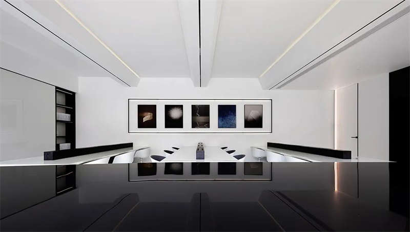 建筑是凝固的音樂,音樂是流動的建筑。二、三層分別是開敞式辦公和高管辦公區(qū),空間整體黑白分明、線條硬朗,像是鋼琴的黑白鍵,揮灑自如,動人的旋律,或悠揚(yáng)或激昂。