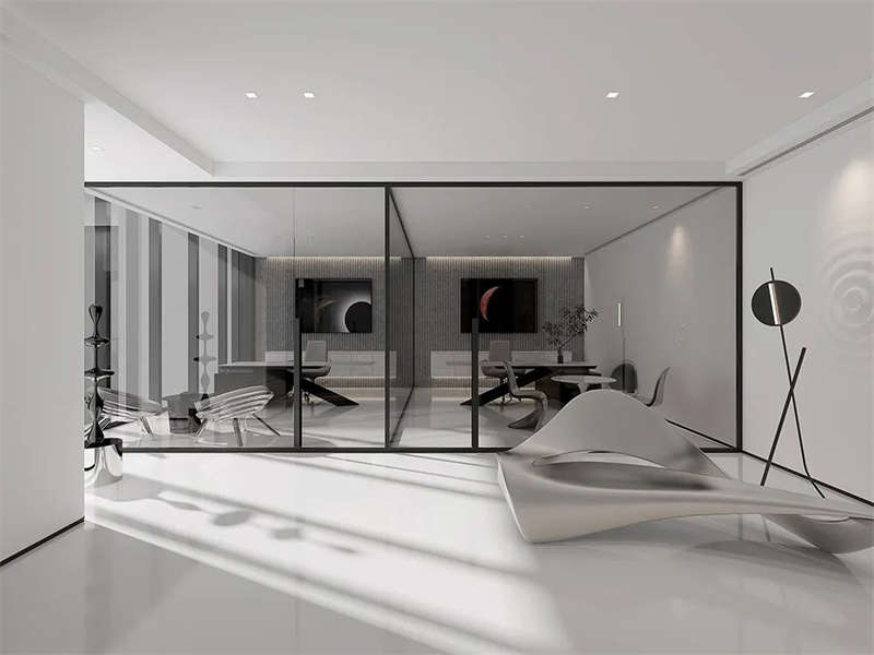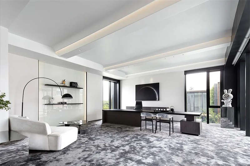 接待區(qū)以沙發(fā)組和會議室實(shí)現(xiàn)休息、接待、和會議功能。沙發(fā)地毯圍合成舒適的功能區(qū),落地?zé)?、藝術(shù)裝置讓這里更有會客廳的親切感,灰色與白色的搭配經(jīng)典時(shí)尚。